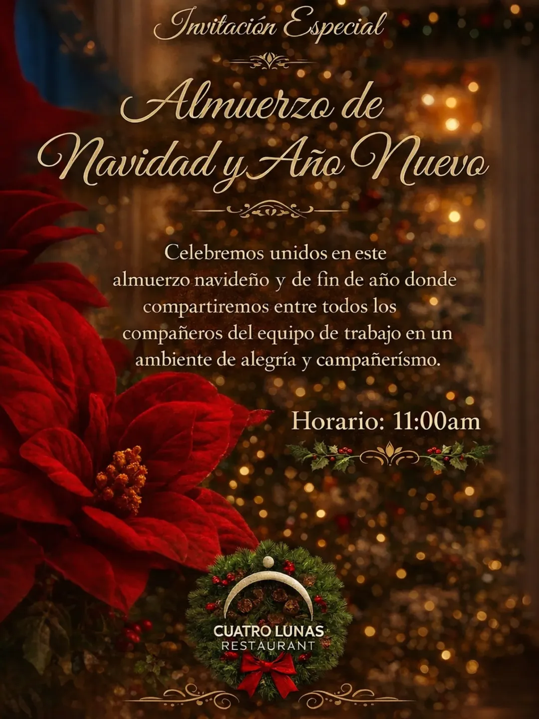 Cuatro Lunas Finalmente logramos reunir a todo el equipo de @cuatrolunas_restaurant para celebrar el almuerzo navideño y de despedida de año, en un ambiente de alegría y compañerismo...